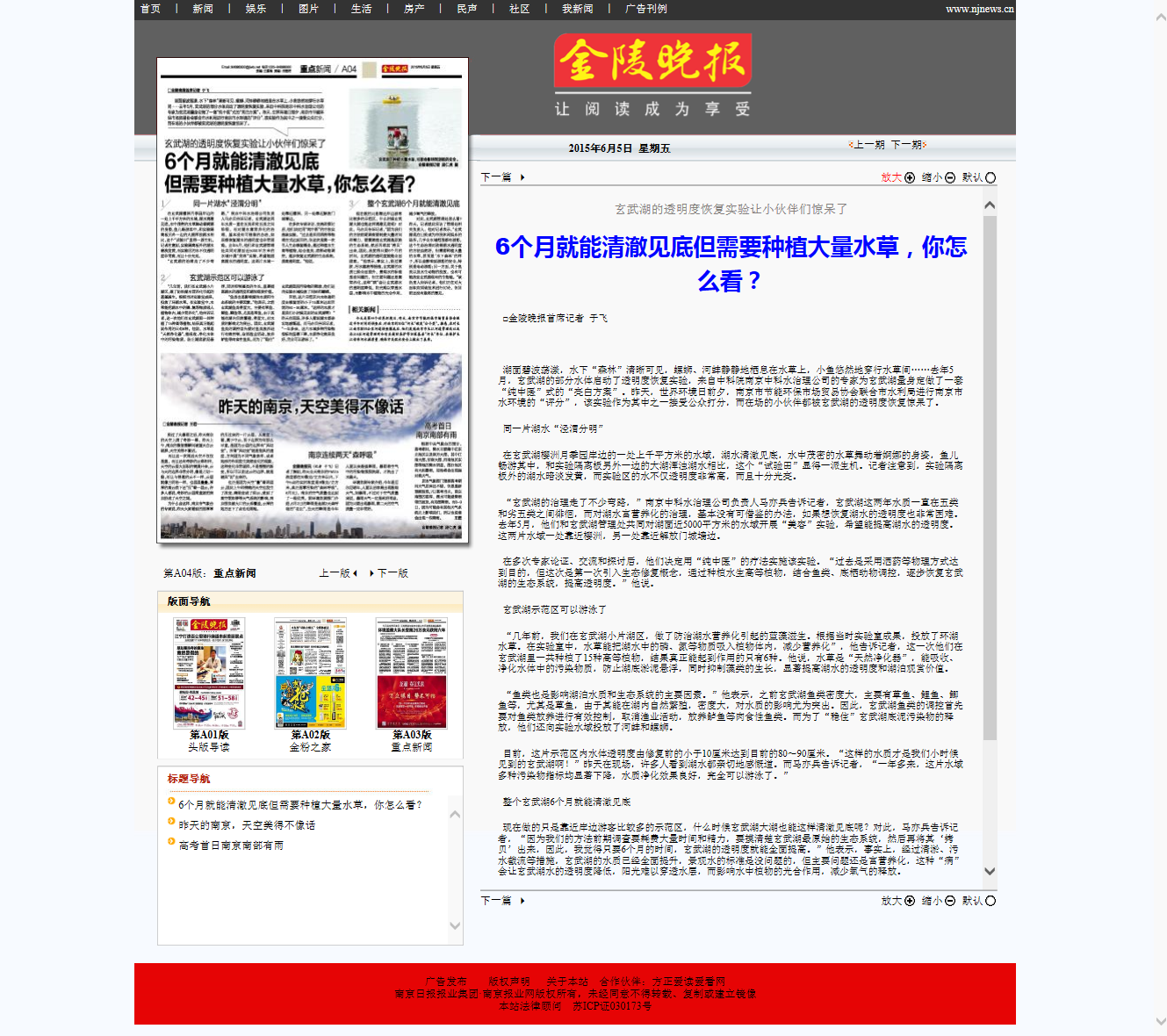 中國環(huán)保新聞網(wǎng)綠色南京頻道對中科水治理采取的純生態(tài)治水法表示贊揚,認為應(yīng)該推廣應(yīng)用,并對水體透明度、水質(zhì)治理效果給與積極肯定。