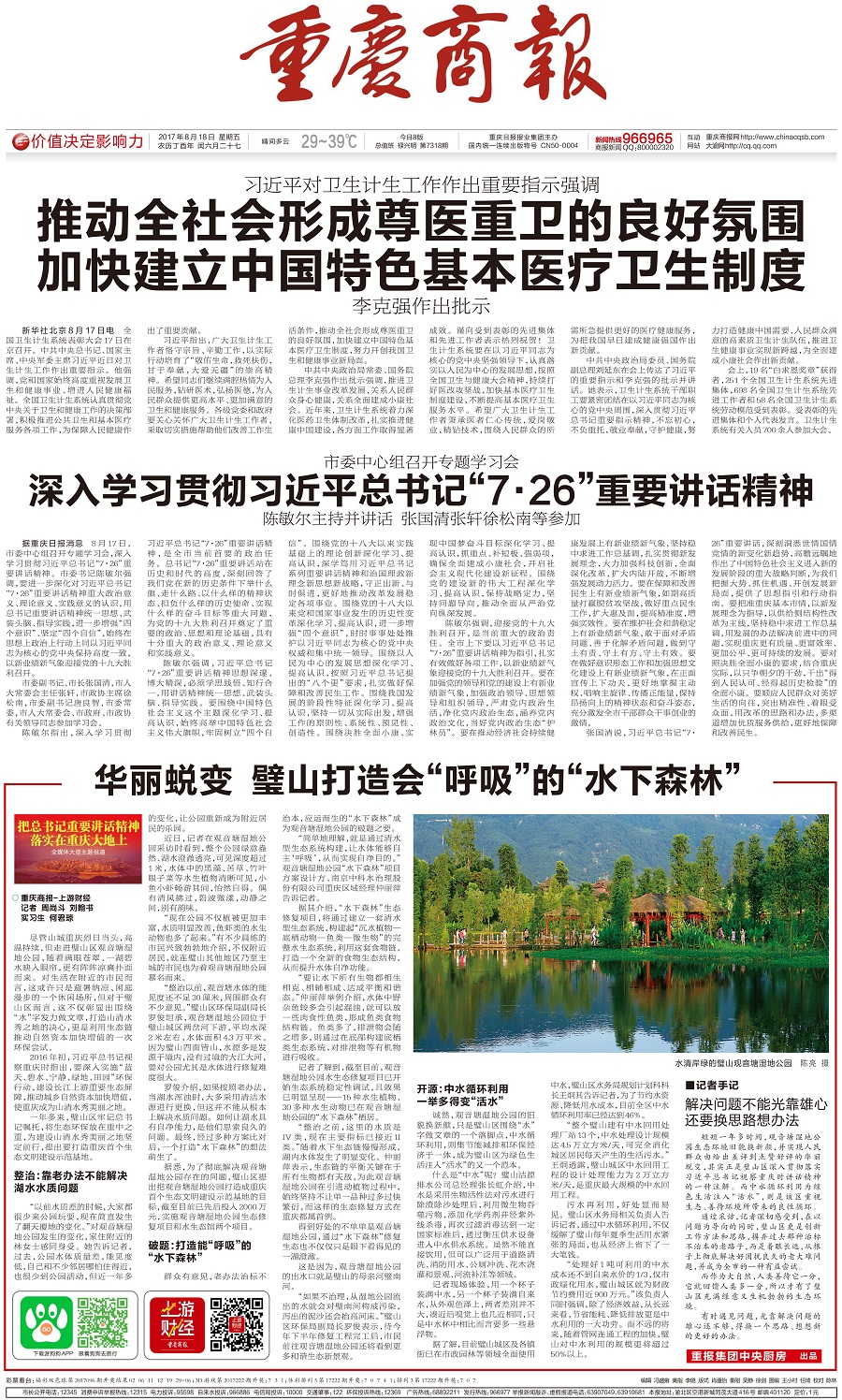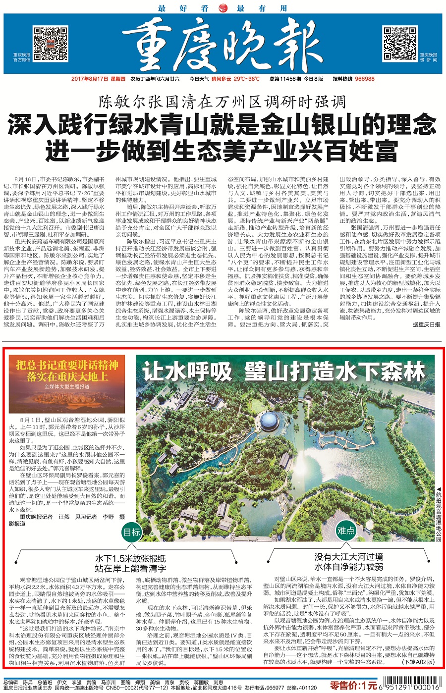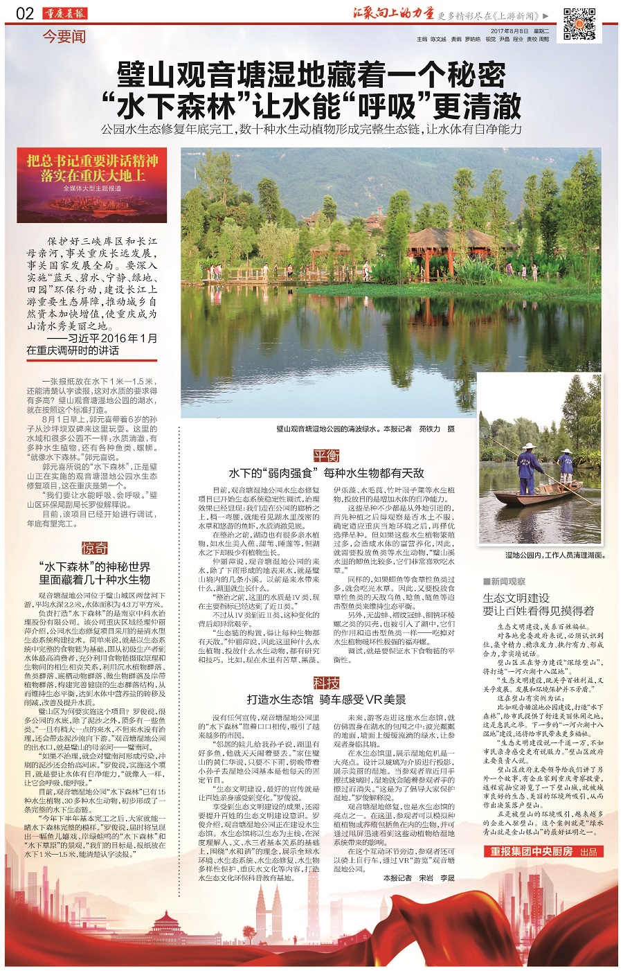 重慶日報、重慶之聲、重慶電視臺、重慶晚報、重慶晨報、重慶商報、華龍網(wǎng)、《當(dāng)代黨員》雜志社等市級主流媒體記者,來到觀音塘濕地公園,實地探訪了“水下森林”建設(shè)情況,采訪了項目設(shè)計施工單位【南京中科水治理股份有限公司】工作人員。觀音塘濕地公園項目是由中科水治理傾力打造的精品水生態(tài)修復(fù)項目,也是重慶市首個生態(tài)文明建設(shè)示范基地。