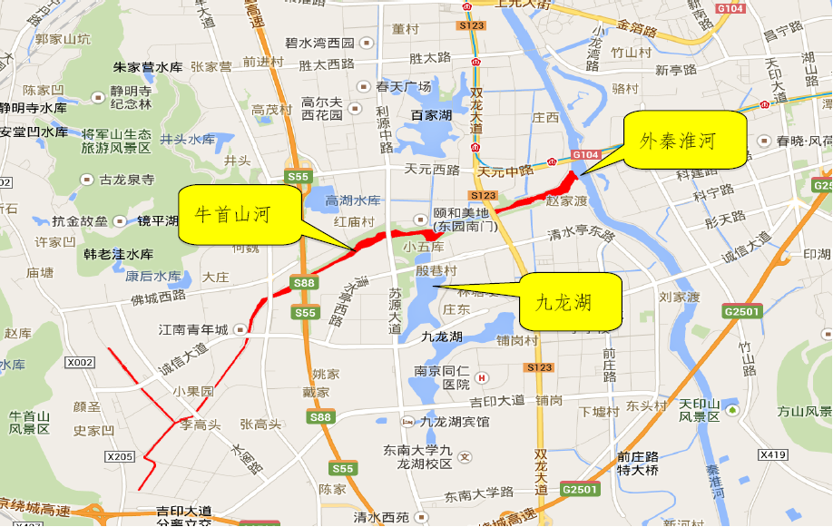 牛首山河總長約8公里,貫穿南京市整個江寧經(jīng)濟技術(shù)開發(fā)區(qū)。沿岸有美麗的九龍湖公園和眾多高檔住宅小區(qū),是周邊居民閑暇散步垂釣的好去處。
