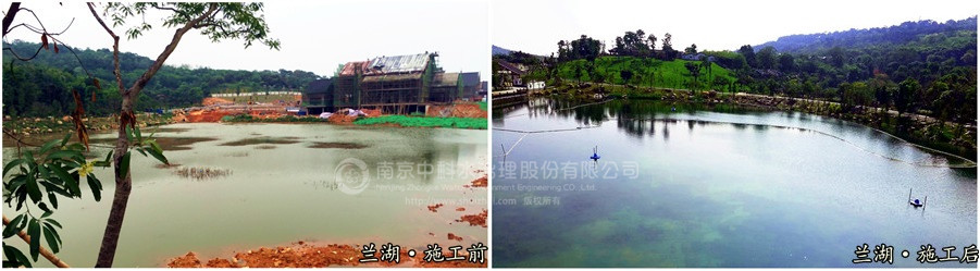 蘭湖屬于原有池塘改造,水域面積16000m2,水深1.2-3m之間,施工后,水體清澈見底,沉水植物生長旺盛,覆蓋率達到75%以上,各項水質(zhì)指標均達到Ⅲ類水標準。