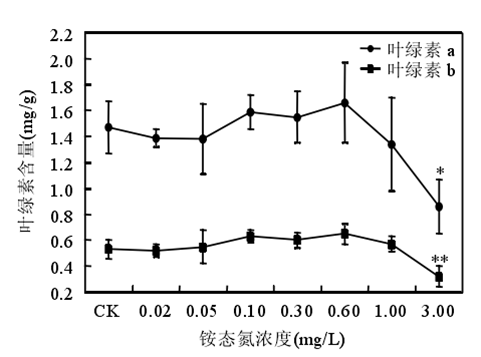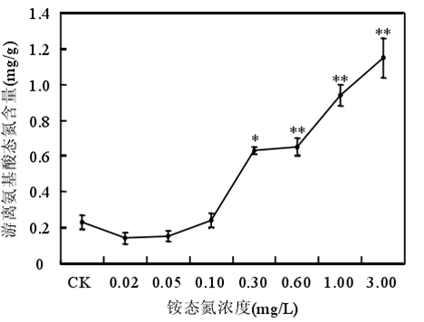 銨態(tài)氮濃度低于 0.60mg/時(shí)苦草生長(zhǎng)良好,濃度大于或等于 1.00mg/L 時(shí)苦草的光合能力受到抑制、代謝受到干擾??嗖輰?duì)銨態(tài)氮最敏感的生理生化指標(biāo)是葉片中游離氨基酸態(tài)氮含量。銨態(tài)氮作為沉水植物的一種營(yíng)養(yǎng)物質(zhì),當(dāng)其含量較低時(shí),植物由于營(yíng)養(yǎng)缺乏誘導(dǎo)產(chǎn)生自由基。