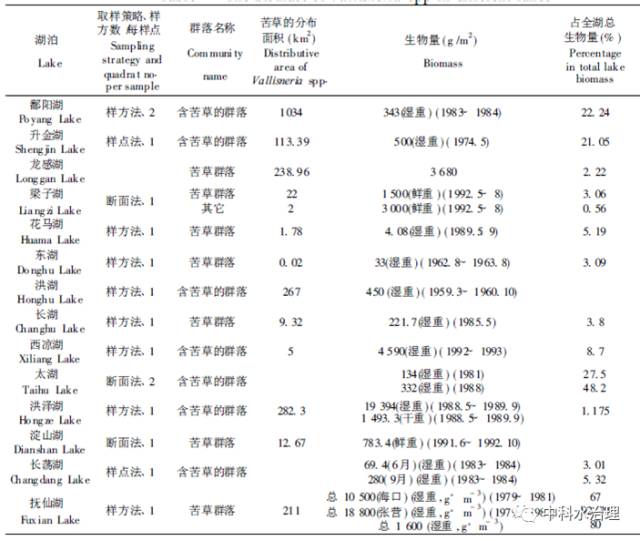 在很多湖泊植被調(diào)查工作中都對(duì)苦草群落或含苦草的群落生物量進(jìn)行了測(cè)定(見下圖)。從表中可以看出,最高和最低生物量之間存在上千倍的差異。這一方面是因?yàn)檎{(diào)查對(duì)象尚包括其它種類,而非苦草本身; 另一方面,也是由于調(diào)查方法本身所致: