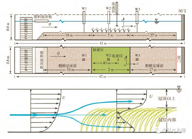 (1) 冠層以上,水流不受苦草冠層的影響,時(shí)均流速呈對(duì)數(shù)分布; 冠層內(nèi)部,由于冠層阻流面積在垂線分布上存在差異,冠層內(nèi)時(shí)均流速呈逆梯度分布,且在床面附近出現(xiàn)局部流速最大值。