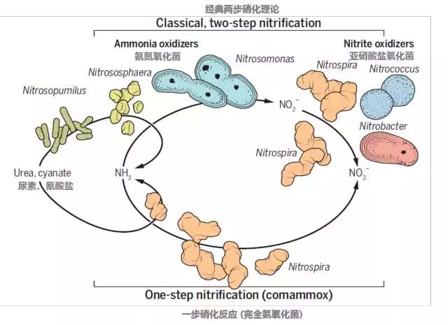 這個理論最先是由俄國微生物界傳奇維諾格拉斯基 (Sergei Winogradsky)早在19世紀(jì)末“成功”展示,他分離出了負責(zé)這兩步硝化的微生物,也就是所謂的AOB(ammonia oxidizing bacteria)和NOB(nitrite oxidizing bacteria)。但這個超過100年歷史的教條在2015年圣誕節(jié)前被英國明星科學(xué)雜志《自然》上的兩篇同日發(fā)表的題目雷同的文章和隨后一篇在美國微生物學(xué)會的文章終結(jié)了。三個科學(xué)團隊發(fā)現(xiàn)了三種不同的培養(yǎng)[1,2]和一種非培養(yǎng)細菌[3]能夠各自進行從氨氮到硝態(tài)氮的完全硝化過程。