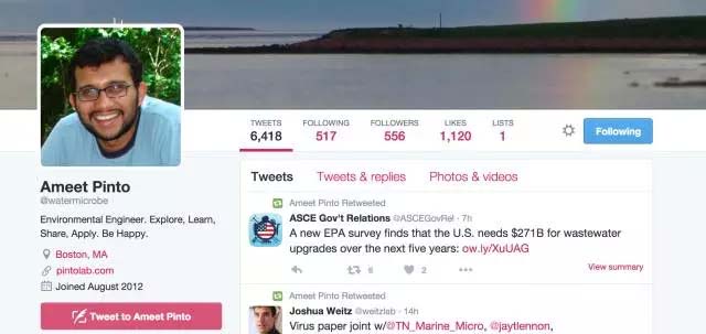 如果你的研究方向和他相似,盡可以跟他聯(lián)系,他的推特賬號是@watermicrobe,email是 a.pinto@neu.edu