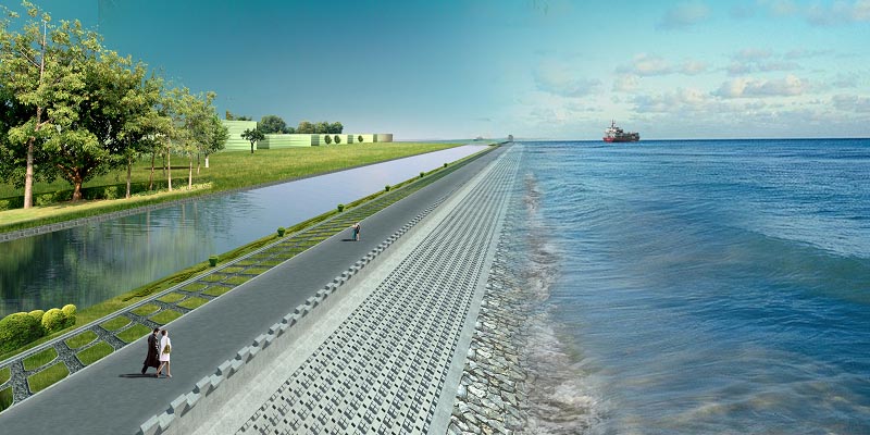 石壩消浪的缺點是投資較大,施工比較復(fù)雜,對示范試驗區(qū)水動力環(huán)境和景觀影響較大,不能保持水面完整。不過對石壩消浪加以改造,能夠比較便捷的打造親水平臺,為人們提供休閑娛樂的平臺,滿足人們的親水需求。